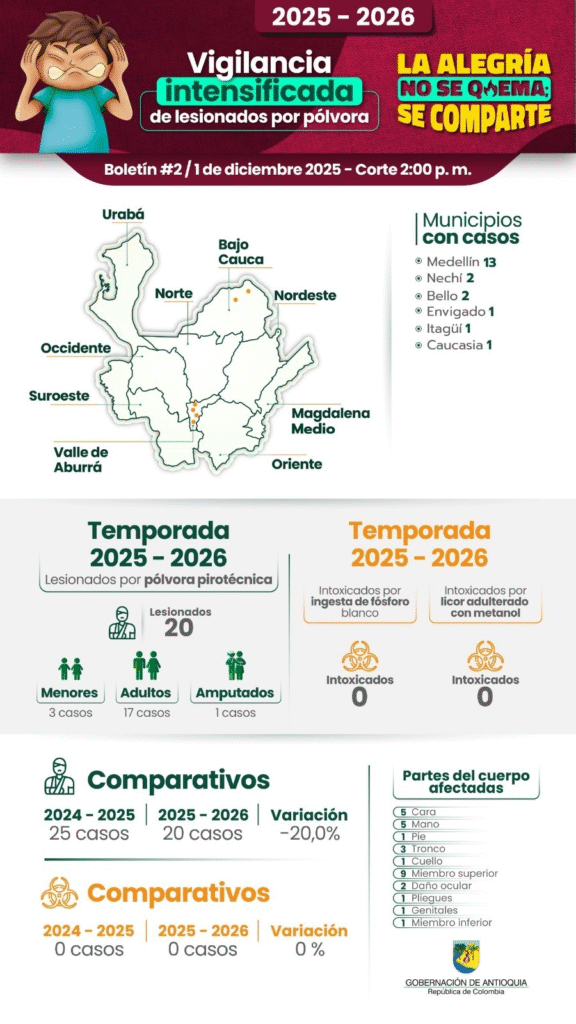 La Gobernación de Antioquia, bajo la campaña institucional «Soy Antipólvora: la alegría no se quema, se comparte», ha reiterado el llamado a la ciudadanía para evitar el uso de estos elementos durante las festividades de Navidad y fin de año. El ente territorial enfatiza que la vigilancia se mantendrá intensificada durante toda la temporada 2025-2026, instando a las familias a celebrar con responsabilidad para evitar que las cifras de quemados sigan aumentando en el transcurso del mes.