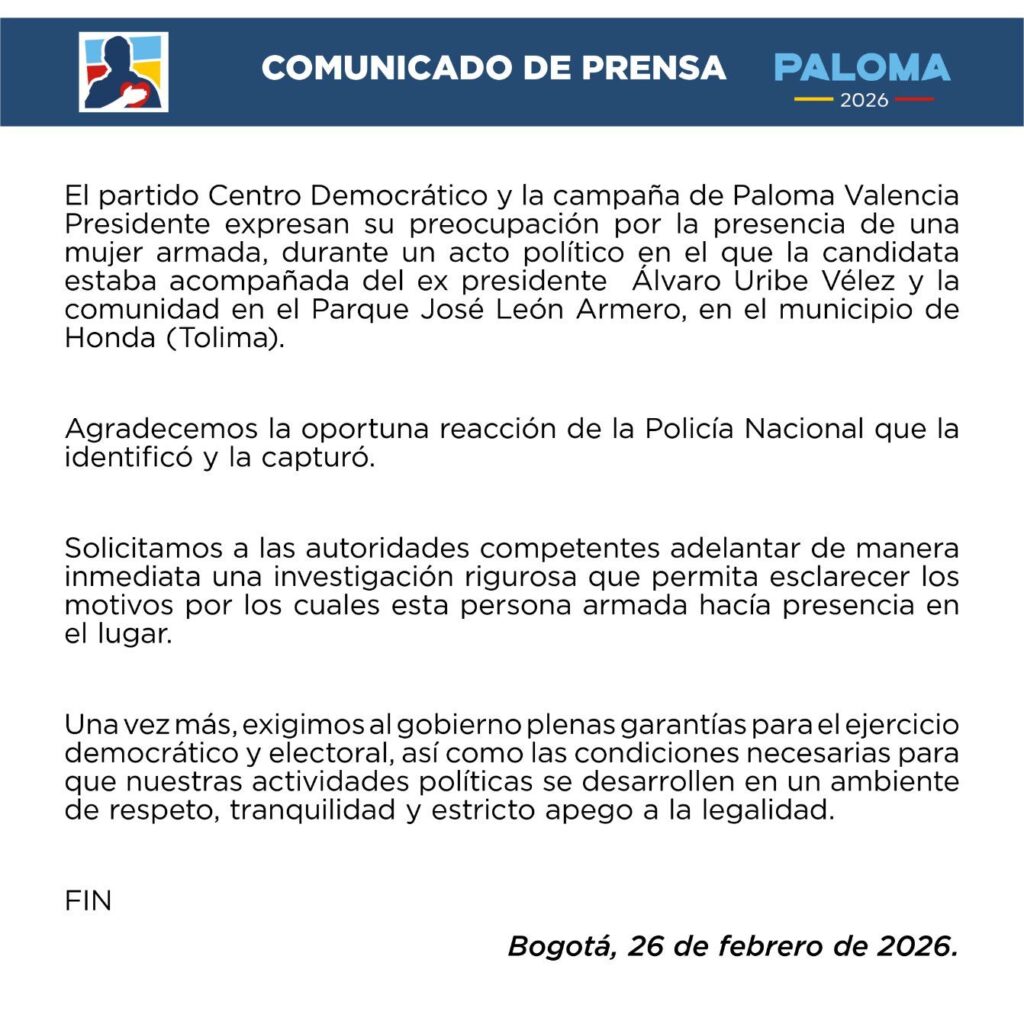 La Policía Nacional capturó a una mujer que portaba un arma de fuego durante un acto político en el que participaban la candidata presidencial del Centro Democrático, Paloma Valencia, y el expresidente Álvaro Uribe Vélez. El evento se realizó el 26 de febrero de 2026 en el parque José León Armero del municipio de Honda, Tolima, como parte de las actividades de campaña previas a la consulta presidencial.