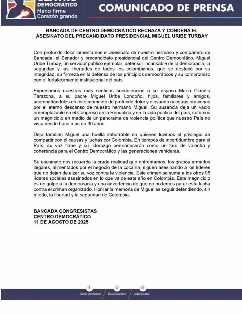 El partido Centro Democrático emitió un comunicado en el que rechazó con fuerza el magnicidio del senador y precandidato presidencial Miguel Uribe Turbay, ocurrido el 11 de agosto de 2025, tras permanecer dos meses hospitalizado por un ataque con arma de fuego durante un mitin en Bogotá.