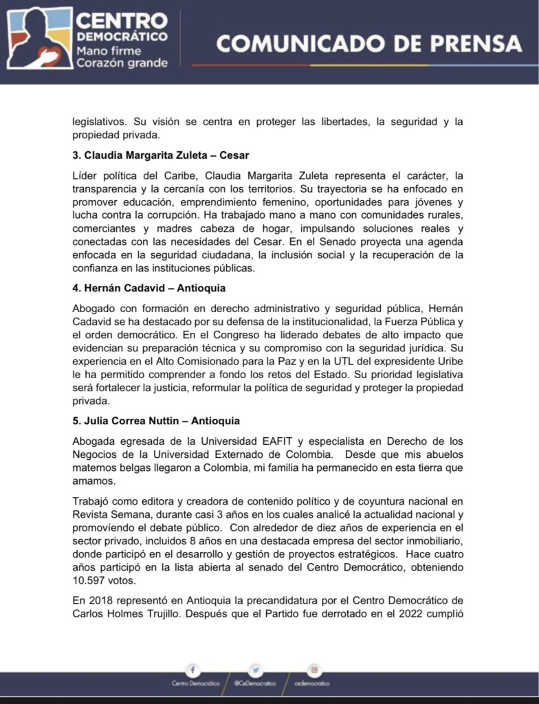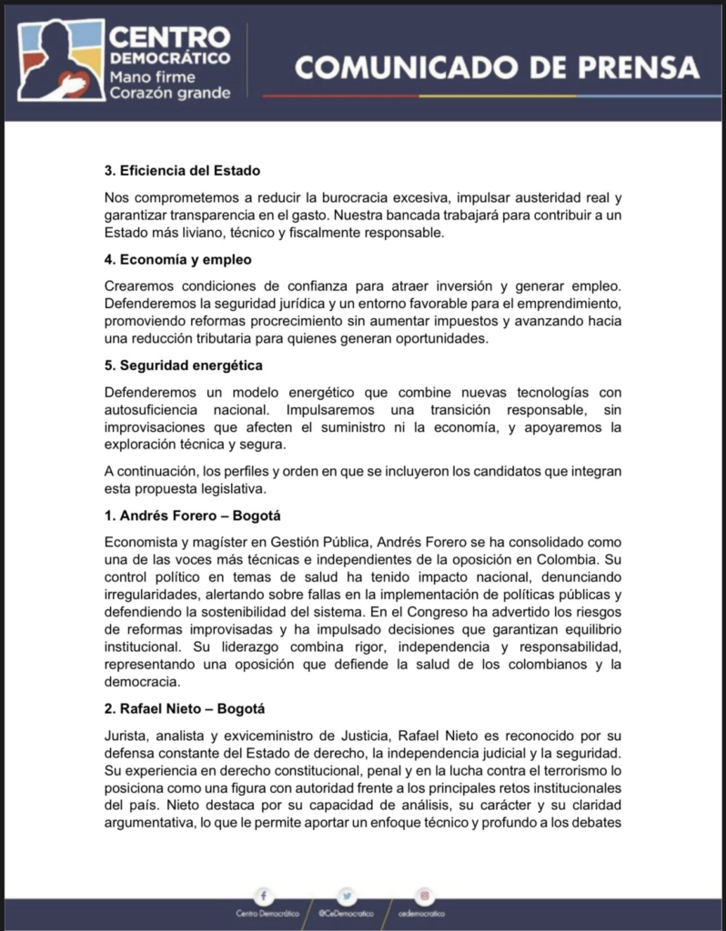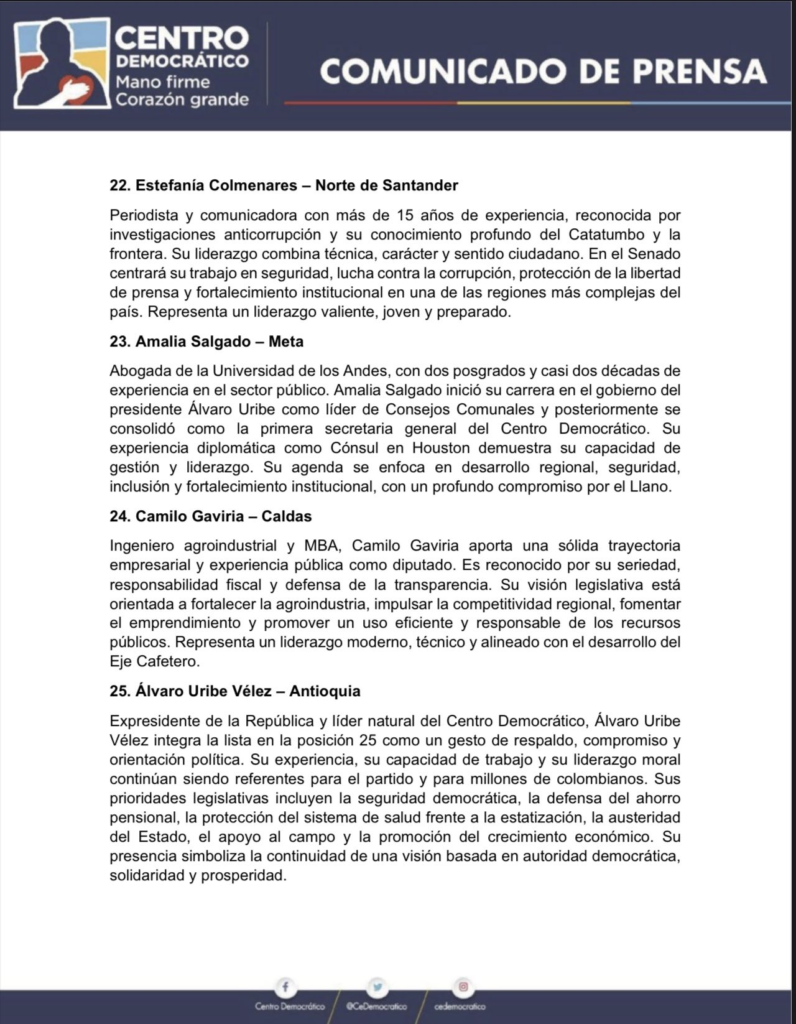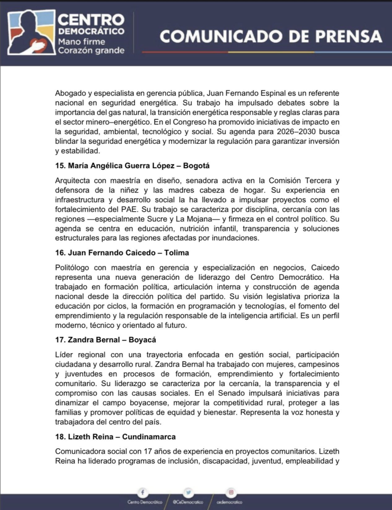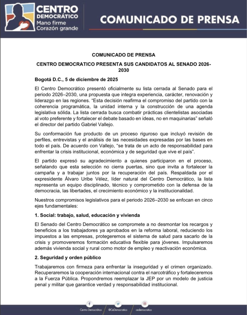 Esta definición se da en un contexto de alta competencia política, donde otras colectividades también han revelado sus fichas claves. El Partido Conservador ha anunciado a David Barguil como su cabeza de lista, mientras que el Pacto Histórico perfila a la exministra Carolina Corcho para liderar su propuesta. Con la lista cerrada y la figura de Uribe empujando desde el margen de lo «posible» (puesto 25), el Centro Democrático plantea las elecciones de 2026 no solo como una votación legislativa, sino como un plebiscito sobre la gestión del actual gobierno nacional.