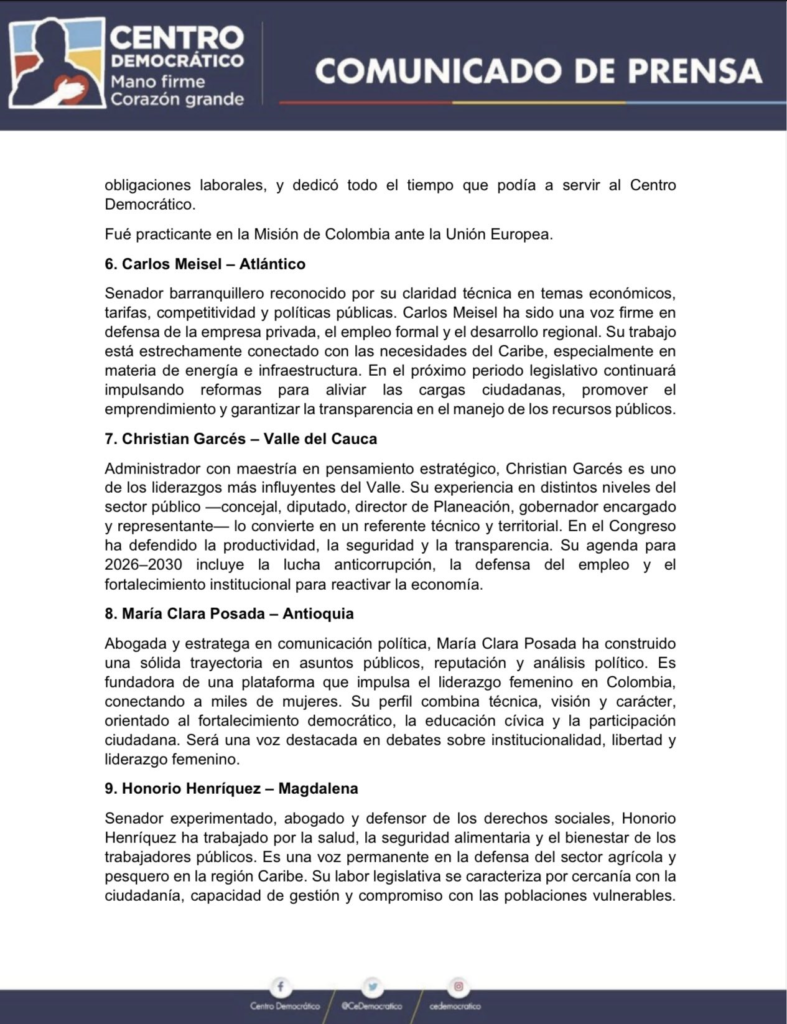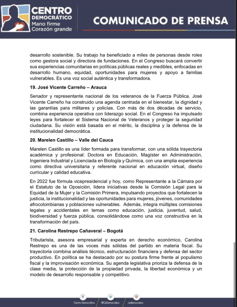 Junto a Forero y Uribe, se espera la confirmación de otros nombres claves que integrarán los puestos de vanguardia (los llamados «renglones seguros»). Entre ellos se barajan actuales senadores que buscan la reelección y que no están compitiendo en la consulta presidencial, así como nuevos liderazgos regionales de Antioquia, el Eje Cafetero y los Llanos Orientales. La lista busca equilibrar la experiencia de figuras tradicionales del partido con cuadros técnicos que puedan sostener el debate en comisiones económicas y constitucionales.