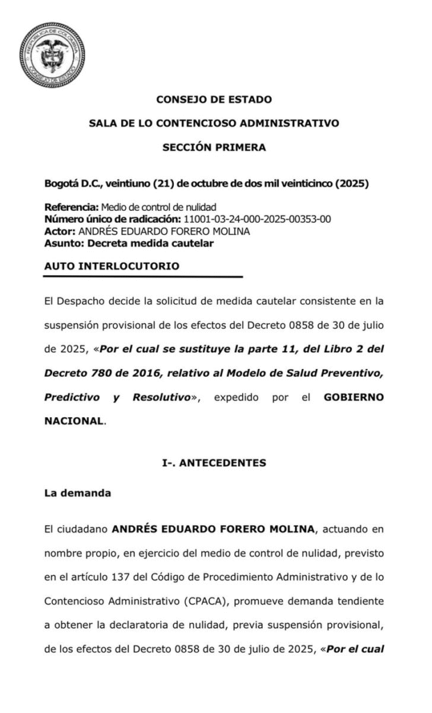 La Sección Primera del Consejo de Estado, encabezada por la magistrada Nubia Margoth Peña, suspendió de forma provisional el Decreto 858 de 2025 del 31 de julio de este año, mediante el cual el Gobierno nacional introdujo una reestructuración unilateral del sistema de salud para instaurar el denominado “Modelo de Salud Preventivo, Predictivo y Resolutivo”.