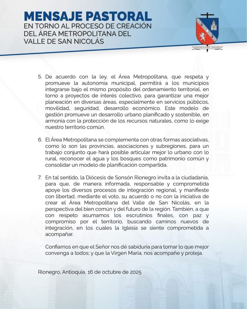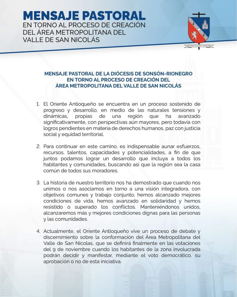 En un comunicado formal emitido el 16 de octubre de 2025, la Diócesis de Sonsón-Rionegro expresó su respaldo al proceso de creación del Área Metropolitana del Valle de San Nicolás, que será definido mediante consulta popular el próximo 9 de noviembre.