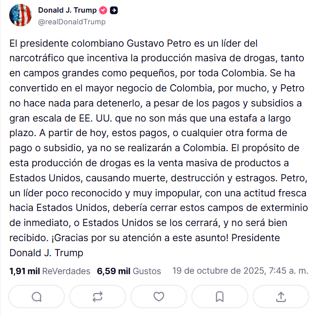 En un mensaje publicado en su plataforma de redes sociales, Trump afirmó que “se ha convertido en el negocio más grande de Colombia, por lejos, y Petro no hace nada para detenerlo, a pesar de los pagos y subsidios a gran escala de los EE.UU. que no son más que una estafa a largo plazo a América”.