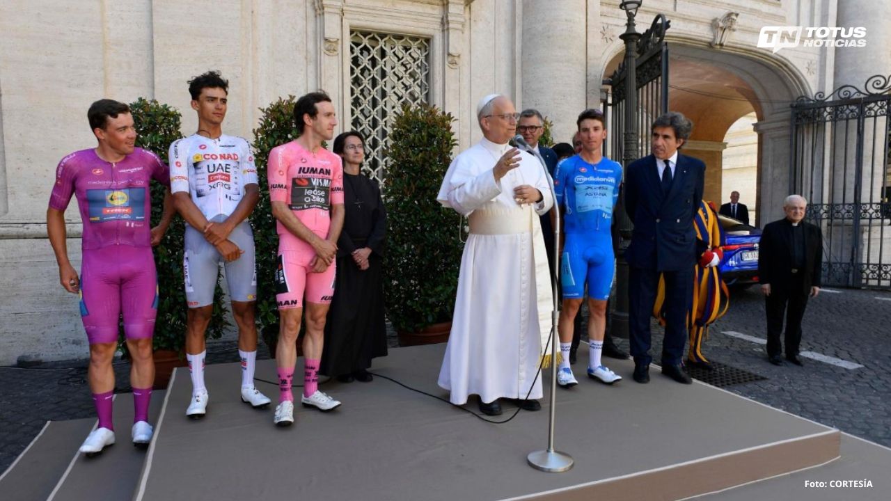 Durante el recorrido por los Jardines Vaticanos, los líderes de las diferentes clasificaciones del Giro, incluyendo a Simon Yates (maglia rosa), Isaac del Toro (mejor joven), Lorenzo Fortunato (rey de la montaña) y Mads Pedersen (campeón por puntos), se detuvieron para saludar al Papa y presentarle una réplica de la camiseta rosa.