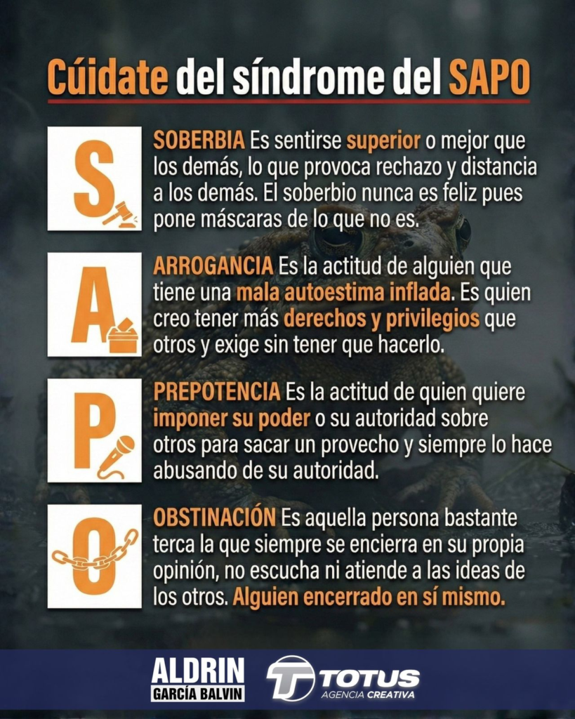 El llamado síndrome del SAPO —soberbia, arrogancia, prepotencia y obstinación— ya no es una metáfora: es una forma de hacer política. Una política ruidosa, excluyente y profundamente autoritaria en lo discursivo, aunque se disfrace de defensa de la libertad.