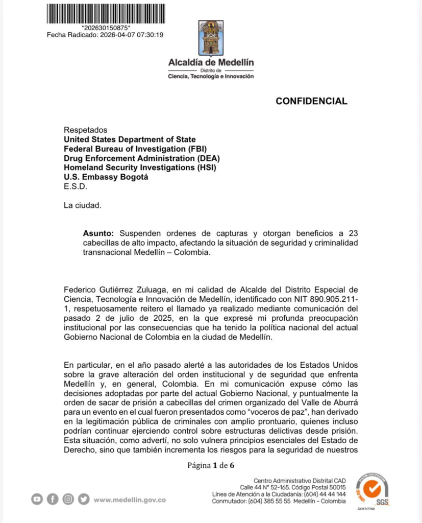 El alcalde de Medellín, Federico Gutiérrez, anunció el envío de documentos formales al FBI, la DEA y al Congreso de la República en los que expone preocupaciones sobre la política de “paz total” del Gobierno nacional, señalando que podría estar siendo utilizada para favorecer a estructuras criminales.