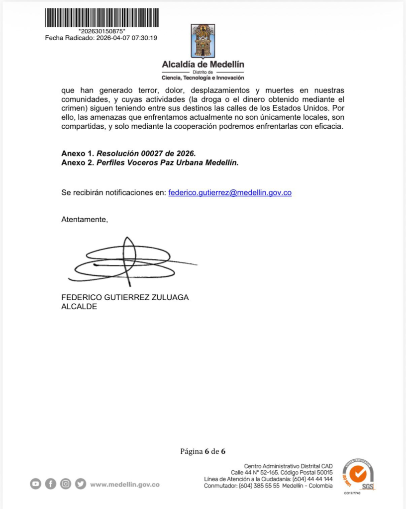 El alcalde también planteó inquietudes sobre el impacto de estas medidas en la cooperación internacional en materia de lucha contra el crimen organizado, motivo por el cual decidió remitir información a agencias estadounidenses como el FBI y la DEA, con el fin de que evalúen el contexto y las decisiones adoptadas en Colombia.