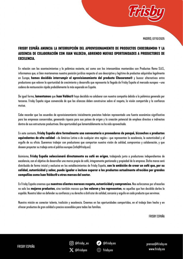 En paralelo, el comunicado lamentó que Juan Valdez —la reconocida cadena de café colombiano— haya decidido no colaborar con la empresa europea. “Lamentamos que Juan Valdez haya decidido no colaborar con nuestra compañía debido a la polémica generada por terceros”, afirmó Frisby España. Frisby España explicó que, al no concretarse esa colaboración, buscará seleccionar su propio café en origen, trabajando directamente con productores independientes para desarrollar una marca propia.