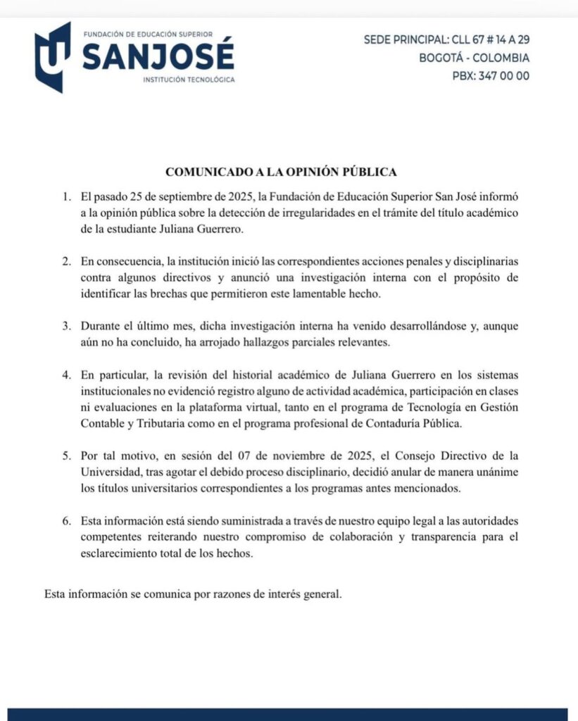 La Fundación de Educación Superior San José confirmó este viernes la anulación de los dos títulos obtenidos por Juliana Guerrero Jiménez, quien aspiraba al cargo de viceministra de Juventud en el Ministerio de la Igualdad. La decisión fue tomada de manera unánime por el consejo directivo de la institución tras hallarse serias inconsistencias en su historial académico.