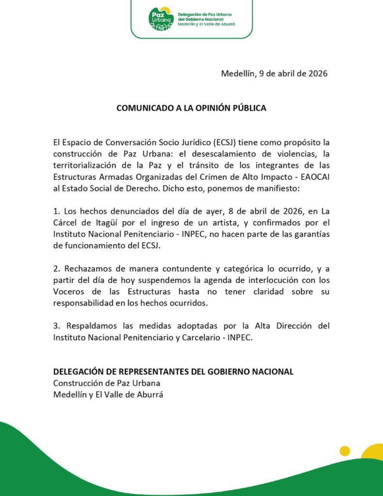 La decisión fue comunicada oficialmente el 9 de abril de 2026 por la Delegación de Paz Urbana del Gobierno Nacional, que indicó que los hechos registrados el día anterior no hacen parte de las garantías de funcionamiento del Espacio de Conversación Socio Jurídico, mecanismo establecido para el desescalamiento de violencias y la transición de integrantes de estructuras criminales hacia la legalidad.