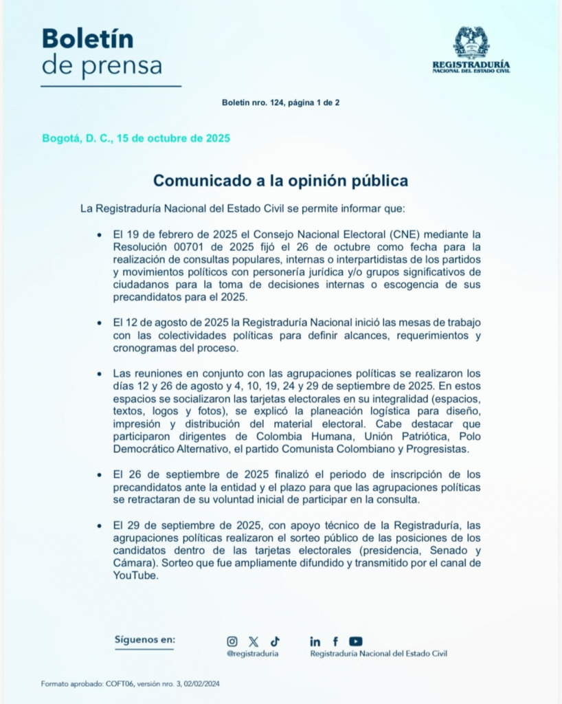 Finalmente, la Registraduría reiteró su compromiso con la transparencia, la eficiencia administrativa y el cumplimiento del calendario electoral, enfatizando que la consulta del 26 de octubre se realizará con total normalidad, garantizando el derecho al voto de todos los ciudadanos.