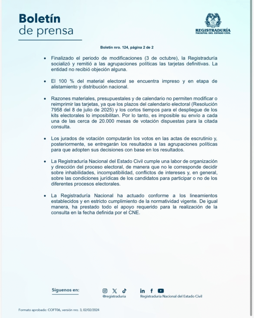 La Registraduría Nacional del Estado Civil informó oficialmente que no realizará modificaciones ni reimpresiones de las tarjetas electorales para la consulta del próximo 26 de octubre de 2025, argumentando razones materiales, presupuestales y de calendario que impiden cualquier cambio a menos de dos semanas de la jornada.