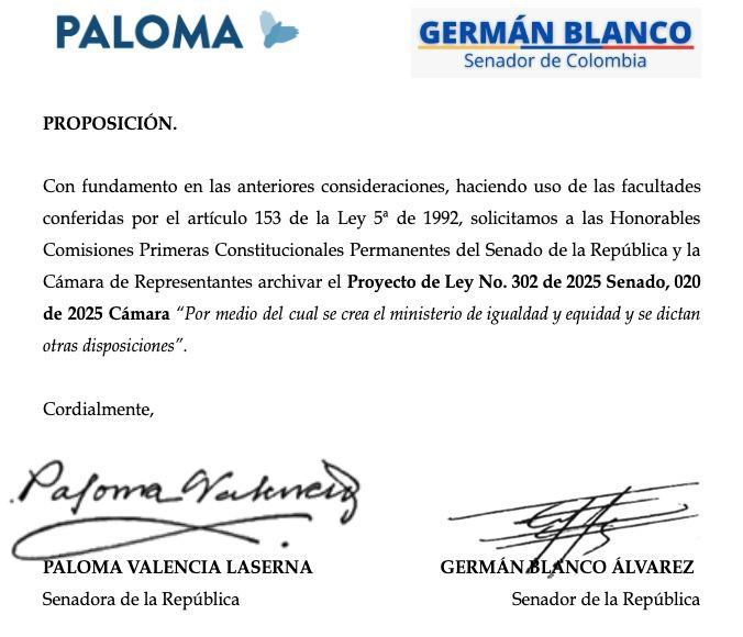 La senadora y precandidata presidencial Paloma Valencia, junto con el senador conservador Germán Blanco, radicaron una ponencia para archivar el proyecto del Gobierno que busca mantener en funcionamiento el Ministerio de Igualdad. Ambos legisladores advierten que la entidad permite una estructura paralela de contratación que, según sus cálculos, podría manejar hasta $1,9 billones bajo derecho privado, sin licitación y sin los controles que establece la Ley 80.