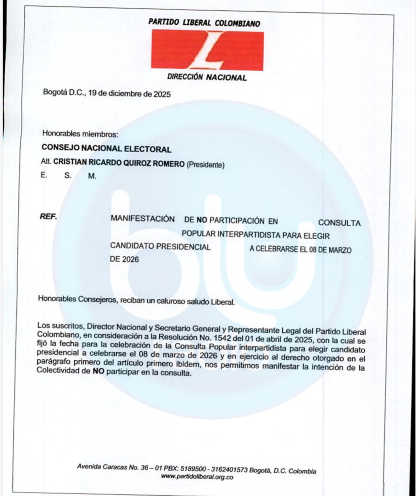 El Partido Liberal Colombiano notificó formalmente al Consejo Nacional Electoral (CNE) su decisión irreversible de no participar en la consulta popular interpartidista programada para el próximo 8 de marzo de 2026. A través de una misiva fechada el 19 de diciembre de 2025, la colectividad roja confirmó que no hará uso de este mecanismo democrático para la elección de su candidato presidencial, sumándose así a la postura adoptada recientemente por el partido Cambio Radical.