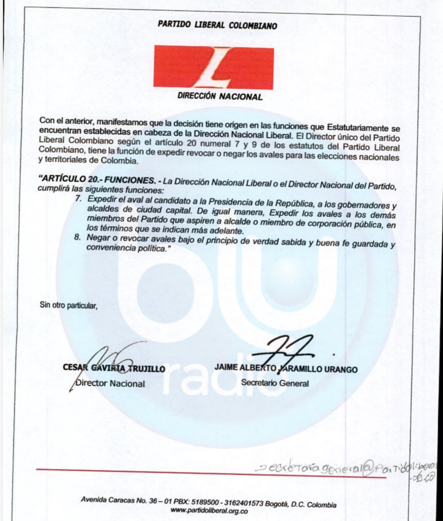 La comunicación lleva la firma del expresidente y Director Nacional del partido, César Gaviria Trujillo, así como del Secretario General, Jaime Alberto Jaramillo Urango. Para sustentar jurídicamente la decisión, los dirigentes citaron el Artículo 20 de los estatutos internos de la colectividad, específicamente los numerales 7 y 8, que facultan a la Dirección Nacional Liberal para expedir, negar o revocar avales bajo el principio de «verdad sabida y buena fe guardada y conveniencia política».