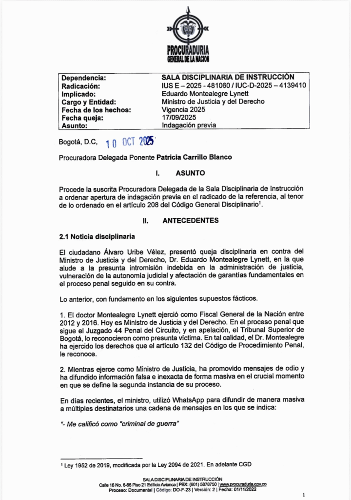 La decisión fue firmada por la procuradora delegada Patricia Carrillo Blanco y fechada el 10 de octubre de 2025. La indagación surge luego de una queja presentada por Uribe Vélez el 17 de septiembre, en la que sostiene que el ministro había difundido mensajes masivos —especialmente por WhatsApp— en los que lo calificaba como “criminal de guerra” y dirigía expresiones ofensivas contra académicos, periodistas y funcionarios aludidos al caso.