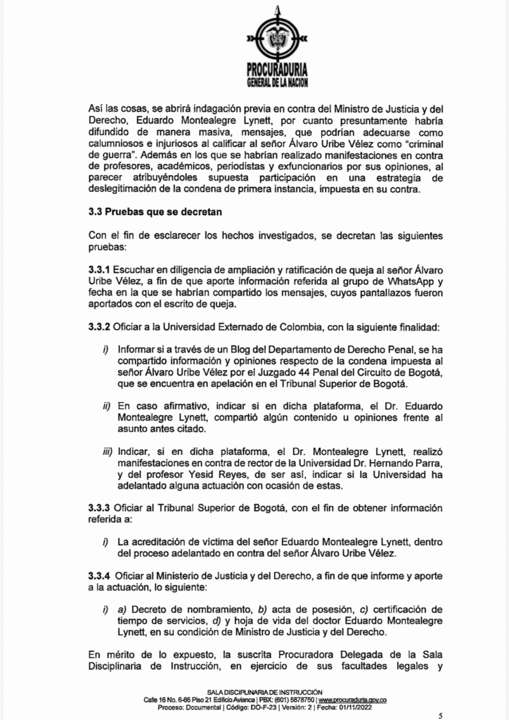 El documento de la Procuraduría señala que Montealegre “ha promovido mensajes de odio y ha difundido información falsa e inexacta de forma masiva en el crucial momento en el que se define la segunda instancia de su proceso”. La indagación prevé prácticas de pruebas como: llamar a ampliación de queja al expresidente Uribe, solicitar información al Tribunal Superior de Bogotá sobre la acreditación de Montealegre como víctima, oficiar al Ministerio de Justicia para que aporte certificado de nombramiento y hoja de vida del ministro, y requerir al Universidad Externado de Colombia datos relacionados con pronunciamientos del funcionario en blogs institucionales.