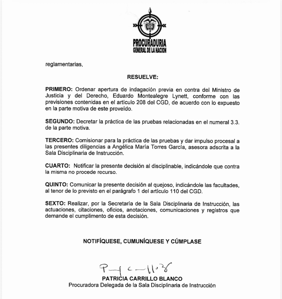 La Procuraduría General de la Nación ordenó la apertura de una indagación disciplinaria preliminar contra el ministro de Justicia, Eduardo Montealegre Lynett, por presunta intromisión indebida en la administración de justicia, vulneración de la autonomía judicial y afectación de garantías fundamentales en el proceso penal que enfrenta el expresidente Álvaro Uribe Vélez.