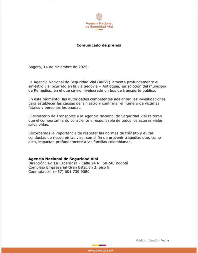 Las primeras hipótesis manejadas por la Dirección de Tránsito y Transporte apuntan a un posible microsueño del conductor o una falla mecánica, sumado a las condiciones de la vía en el momento del siniestro. Agentes de criminalística adelantan las labores de inspección técnica en el lugar, mientras la comunidad del nordeste y el Valle de Aburrá se une en solidaridad frente a uno de los accidentes escolares más graves registrados en el departamento en los últimos años.