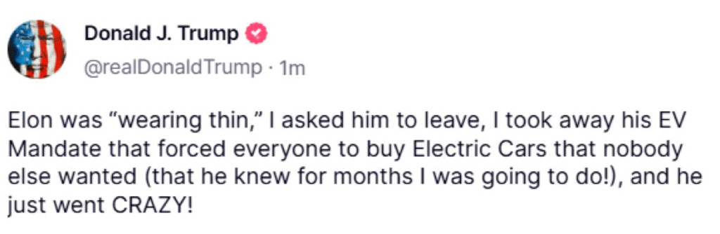 Trump también expresó su decepción con Musk, afirmando que el empresario «se volvió loco» después de que se eliminara el mandato de vehículos eléctricos que, según Trump, obligaba a todos a comprar autos eléctricos que nadie quería.
