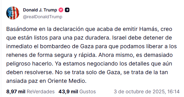 La reacción de Trump ocurre en el contexto del plan de paz de 20 puntos que él presentó recientemente junto con el primer ministro israelí, Benjamin Netanyahu, como propuesta para poner fin al conflicto entre Israel y Hamás. En ese esquema, Hamás se comprometió a liberar todos los rehenes bajo ciertas condiciones, aunque con reservas sobre algunas cláusulas, como la desestimación parcial del poder del movimiento en Gaza. Israel, por su parte, declaró que está listo para implementar la primera fase del plan, enfocada en la liberación de rehenes, aunque no aceptó explícitamente todas las exigencias de cese inmediato de hostilidades.